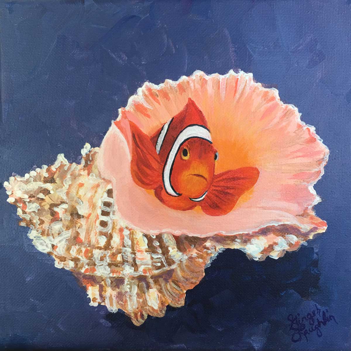 “Bubbles” has texture and layers of colors. The background washes show the fluidity of the sea. She positively radiates charm and panache! 24″x 36″ acrylic